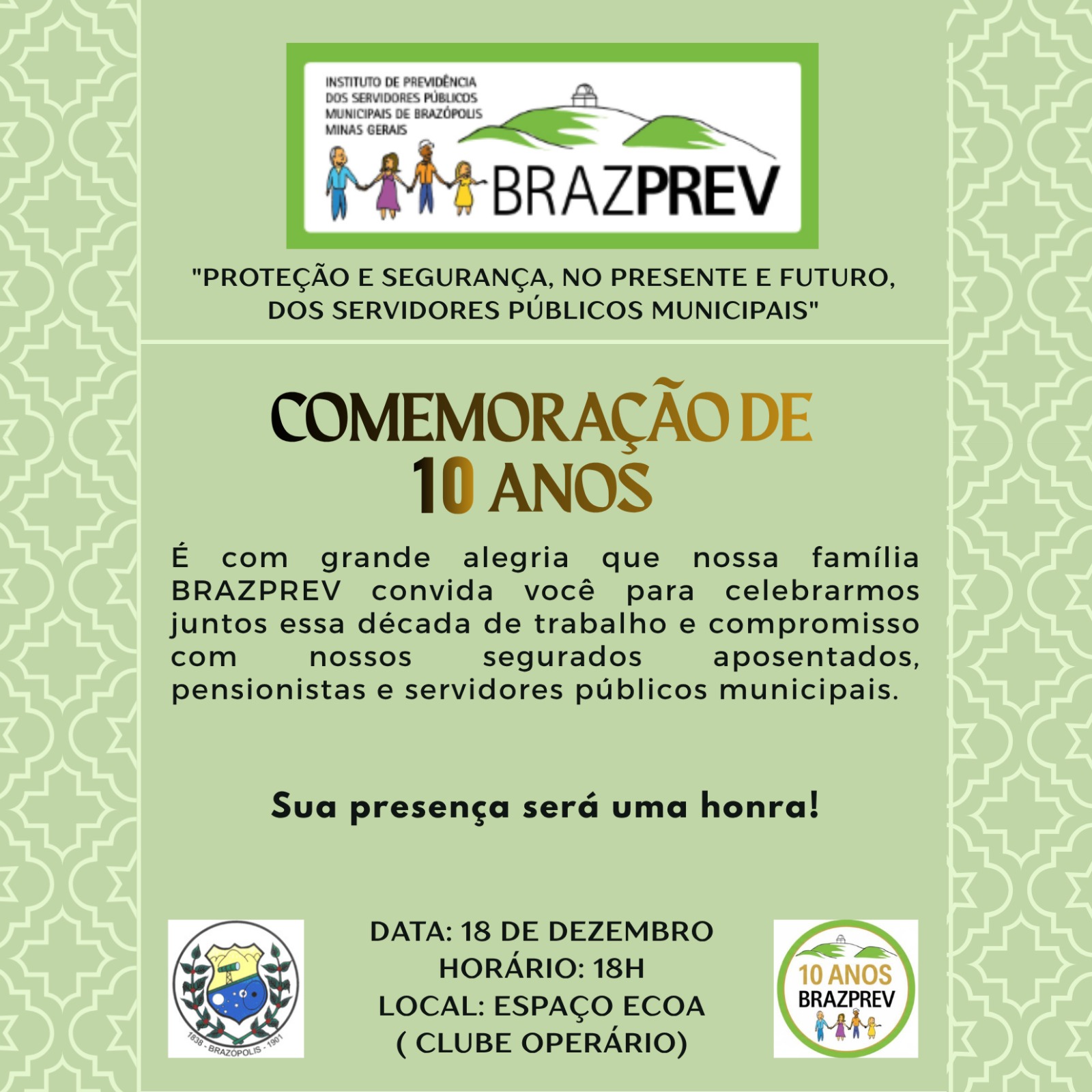 Para marcar os 10 anos de história, o BRAZPREV realiza um evento comemorativo no dia 18 de dezembro, às 18h, no Espaço Ecoa (Clube Operário), em Brazópolis. A celebração reunirá servidores ativos, aposentados, pensionistas, parceiros e a comunidade, em um momento de valorização da previdência municipal e de reconhecimento da trajetória construída ao longo da última década. A participação é aberta a todos os interessados