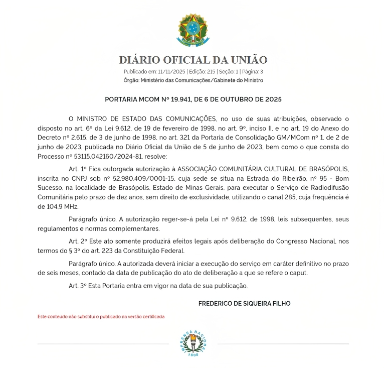 A emissora recebeu a Outorga do Ministério das Telecomunicações em 06/10/2025 e opera com 25 watts de potência.